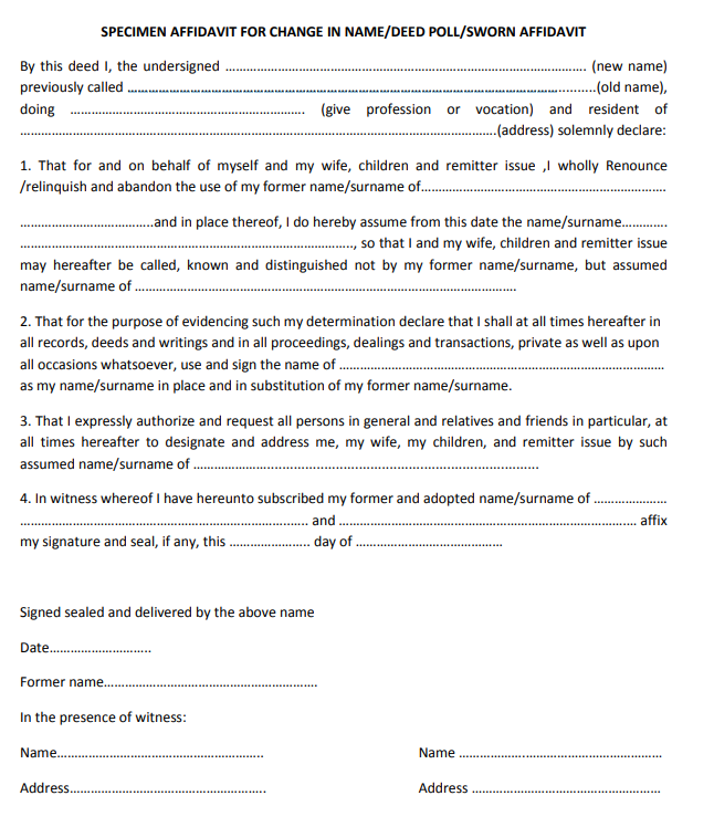 The first step in the name change procedure is to create an affidavit to clarify the intention behind the name change. The Affidavit should include your current Name and new Name, and It must be signed in the presence of a first-class magistrate, notary public, or a court official.